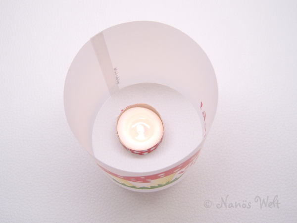 Du erhältst das Windlicht fertig vorbereitet und musst nur noch die beiden Enden mit dem bereits aufgebrachten transparenten Klebestreifen zusammenfügen. Kein Flüssigkleber-Verschmieren!